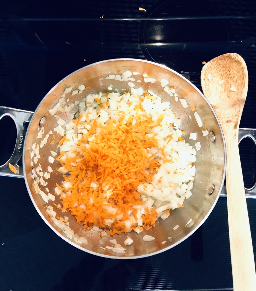 Add in shredded carrot and a large pinch of salt; cook for 5-7 minutes stirring occasionally. Add garlic, cook for 2-3 minutes.