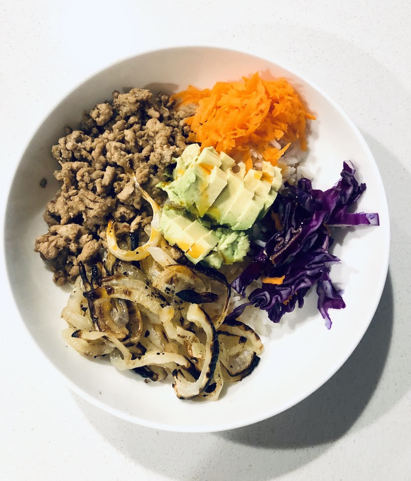 - To assemble the rice bowl: Layer 1/2 cup of white rice at the bottom of the bowl; assemble meat, carrot, cabbage, onion and avocado around the bowl; and top with fried egg. For an added kick, drizzle chili oil or sriracha over the top!