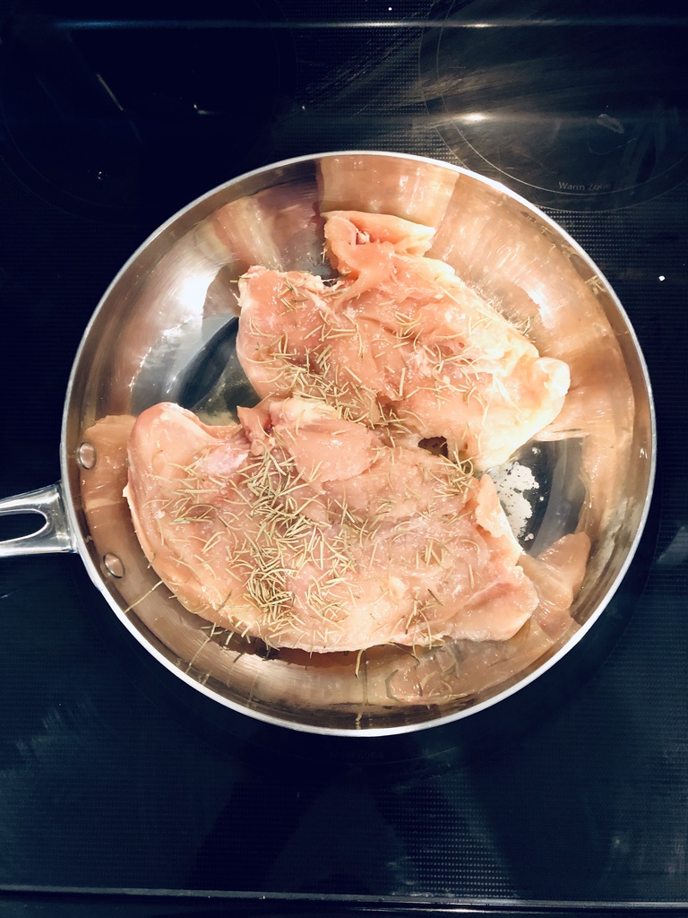 - Season chicken breasts with salt, pepper, and rosemary. Tip: When using dried herbs (such as rosemary) crush them in your hand before adding them to the recipe– this helps release the oils and will increase both fragrance & flavor!