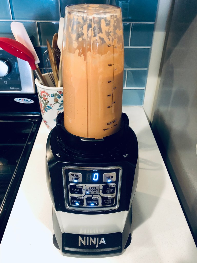 2. In a blender (I’m using the Ninja smoothie attachment–mine is oversized so you may need to use your regular blender) combine cashews, crushed tomato, oregano, parmesan cheese, & pasta water– wait to take the pasta water until the pasta is almost finished cooking (you want the water to be starchy).