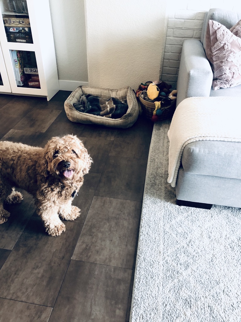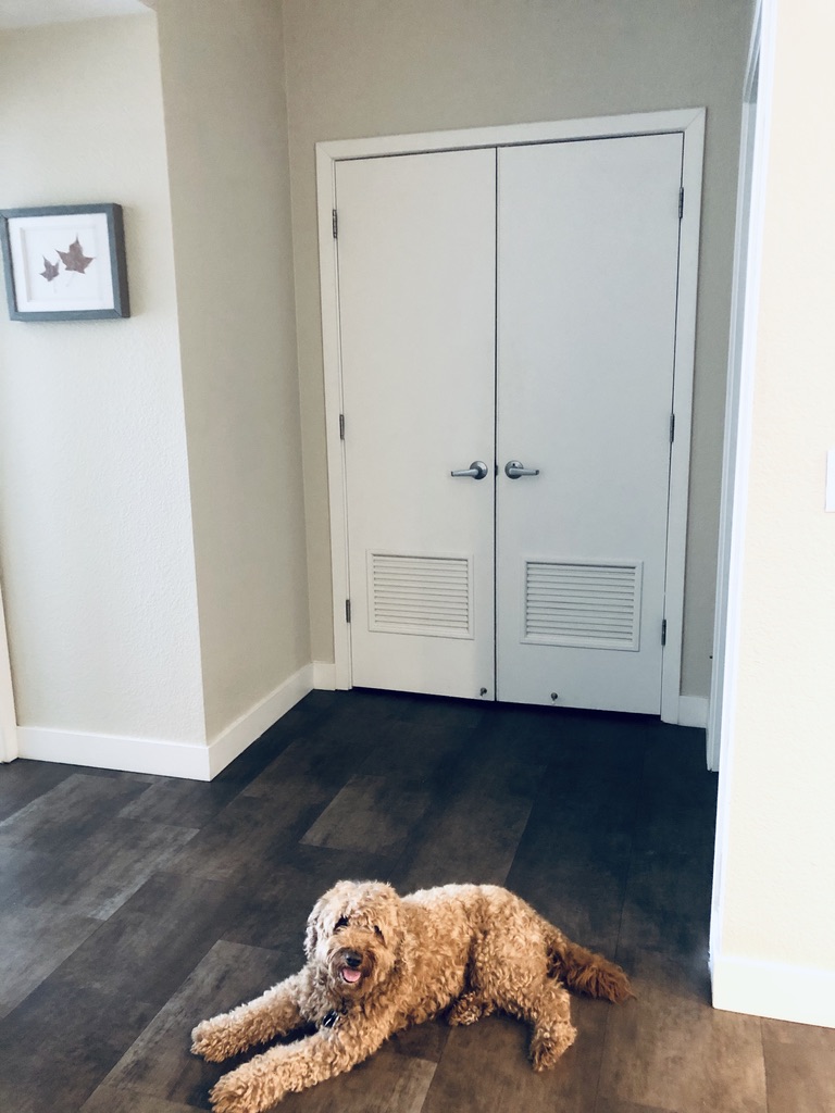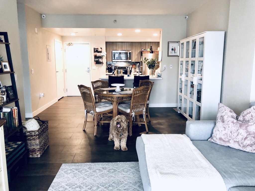 One of the things I loved immediately about this apartment was the backsplash in the kitchen… how cute are those blue subway tiles!? Even though we don’t have a ton of space I’m really grateful for how big our kitchen is– a lot of pasta has been made on that island! Our front door is right behind that sleeping doodle (who I couldn’t bare to wakeup just to take a picture ❤ ).