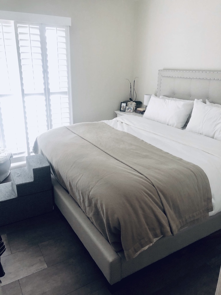 Our bedroom is really small and basically just fits our king sized bed and one nightstand, but to me it feels cozy! Again, that giant window helps make the room feel bigger and more open. Just like in the living room the shudders slide open to our juliet balcony– we don’t actually go out there but I keep my plants out there 🙂