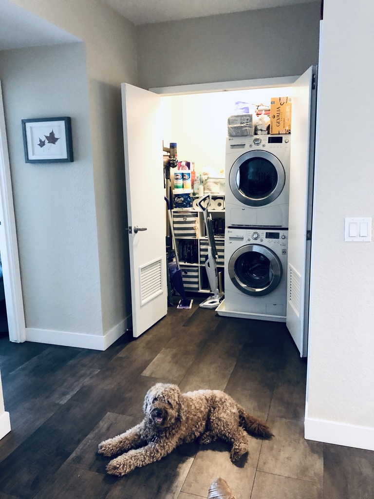 Our dining area is right in front of Wyatt, the bedroom is on the left and the bathroom is on the right– just for reference. Having an in-unit washer and dryer is such a luxury in SF, as is all of this storage space!!