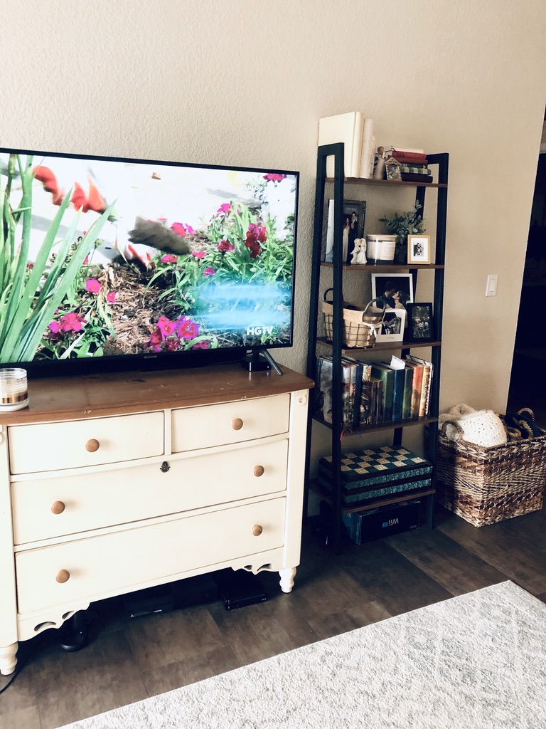 This entertainment center (AKA my childhood dresser) doubles as our linen storage– there’s zero room in the bedroom to store extra sheets and blankets so they live out here!