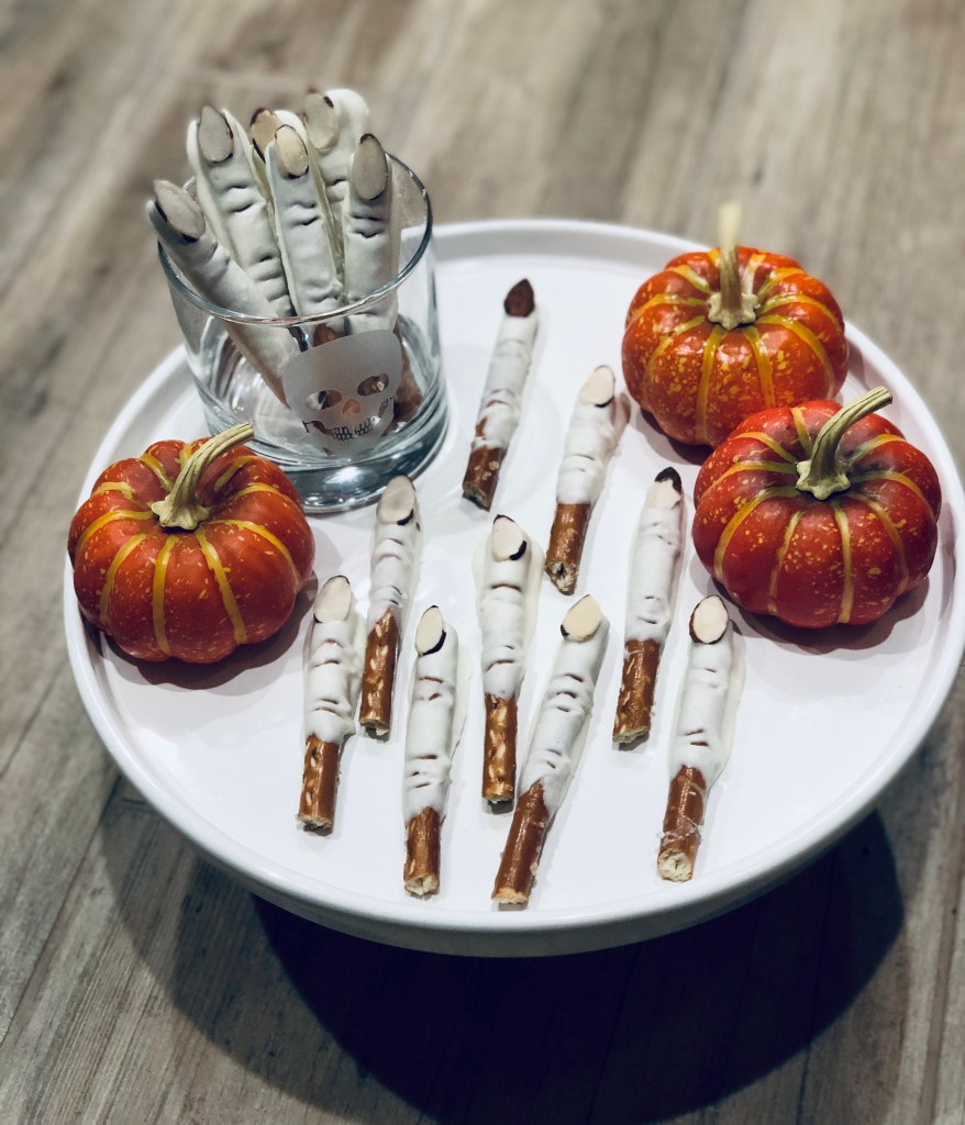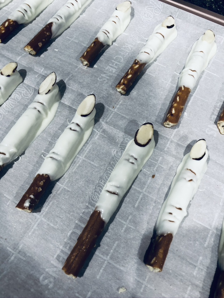 Back to this tasty, yet kind of disturbing treat. You can whip these babies out in just a matter of a few minutes. You’re basically dipping pretzel rods into melted chocolate and adding a sliced almond to the end to look like a fingernail. GROSS. But hey isn’t that what Halloween season is all about!?