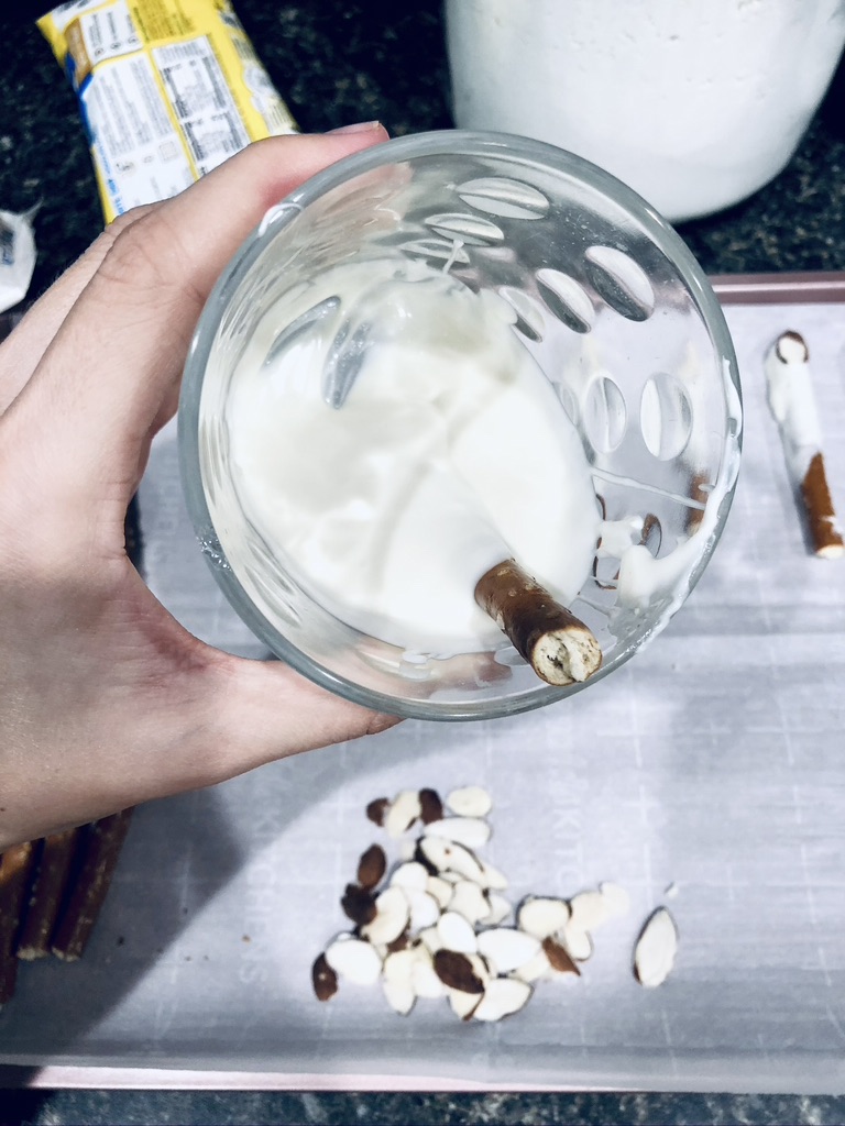 2. Break the pretzel rods in half. Pour melted chocolate into a drinking glass (to make dipping the pretzels easier) and dip 3/4 of the pretzel rod into the melted chocolate (leave the broken end of the pretzel out of the chocolate).